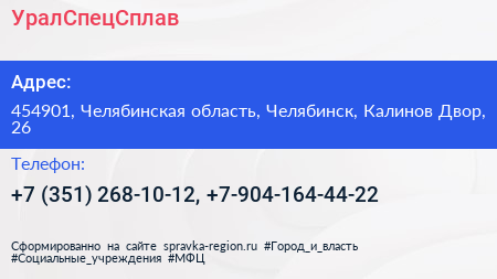 УралСпецСплав по адресу 454901, Челябинская область, Челябинск, Калинов Двор, 26 в дальнейшем Организация, размещена в следующих категориях: