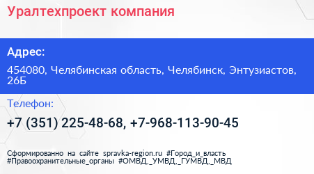 Уралтехпроект, компания по адресу 454080, Челябинская область, Челябинск, Энтузиастов, 26Б в дальнейшем Организация, размещена в следующих категориях: