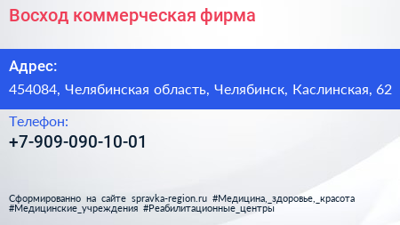 Восход, коммерческая фирма по адресу 454084, Челябинская область, Челябинск, Каслинская, 62 в дальнейшем Организация, размещена в следующих категориях: