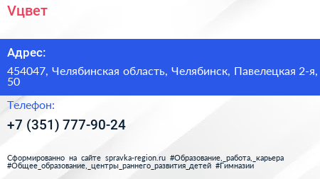 Vцвет по адресу 454047, Челябинская область, Челябинск, Павелецкая 2-я, 50 в дальнейшем Организация, размещена в следующих категориях: