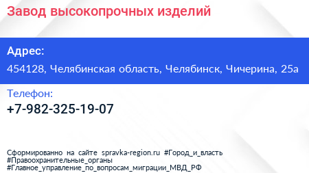 Завод высокопрочных изделий по адресу 454128, Челябинская область, Челябинск, Чичерина, 25а в дальнейшем Организация, размещена в следующих категориях:
