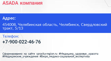 ASADA, компания по адресу 454008, Челябинская область, Челябинск, Свердловский тракт, 5/13 в дальнейшем Организация, размещена в следующих категориях: