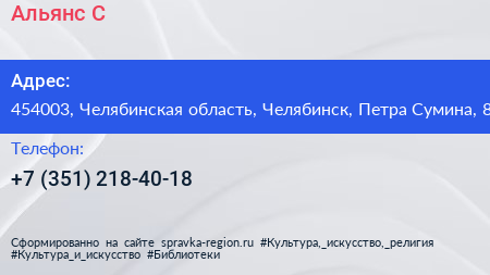 Альянс С по адресу 454003, Челябинская область, Челябинск, Петра Сумина, 8 в дальнейшем Организация, размещена в следующих категориях: