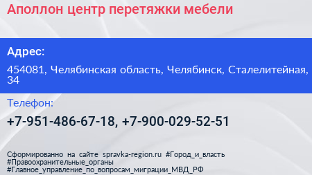Аполлон, центр перетяжки мебели по адресу 454081, Челябинская область, Челябинск, Сталелитейная, 34 в дальнейшем Организация, размещена в следующих категориях: