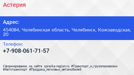 Астерия по адресу 454084, Челябинская область, Челябинск, Кожзаводская, 20 в дальнейшем Организация, размещена в следующих категориях: