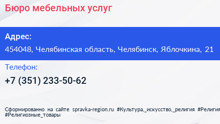 Бюро мебельных услуг по адресу 454048, Челябинская область, Челябинск, Яблочкина, 21 в дальнейшем Организация, размещена в следующих категориях: