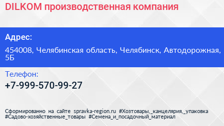 DILKOM, производственная компания по адресу 454008, Челябинская область, Челябинск, Автодорожная, 5Б в дальнейшем Организация, размещена в следующих категориях: