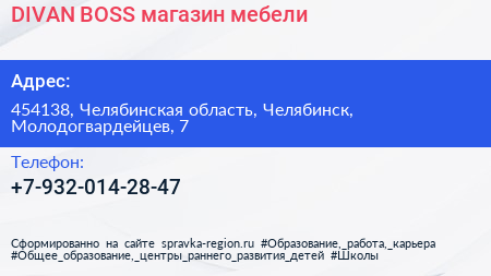 DIVAN BOSS, магазин мебели по адресу 454138, Челябинская область, Челябинск, Молодогвардейцев, 7 в дальнейшем Организация, размещена в следующих категориях: