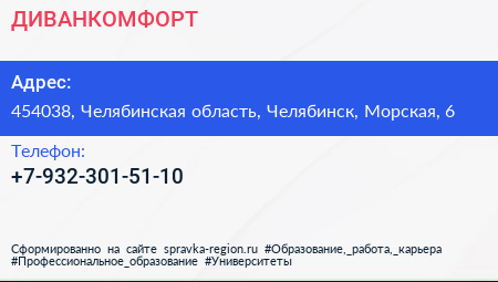 ДИВАНКОМФОРТ по адресу 454038, Челябинская область, Челябинск, Морская, 6 в дальнейшем Организация, размещена в следующих категориях:
