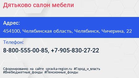 Дятьково, салон мебели по адресу 454100, Челябинская область, Челябинск, Чичерина, 22 в дальнейшем Организация, размещена в следующих категориях:
