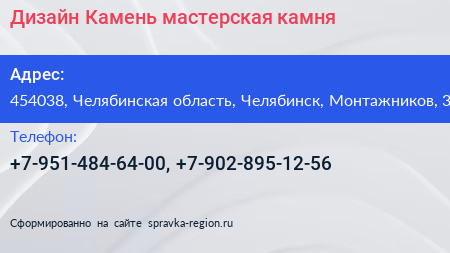 Дизайн Камень, мастерская камня по адресу 454038, Челябинская область, Челябинск, Монтажников, 3 в дальнейшем Организация, размещена в следующих категориях: