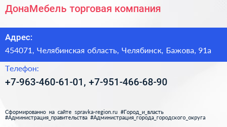 ДонаМебель, торговая компания по адресу 454071, Челябинская область, Челябинск, Бажова, 91а в дальнейшем Организация, размещена в следующих категориях: