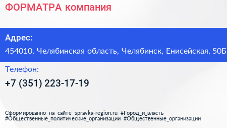 ФОРМАТРА, компания по адресу 454010, Челябинская область, Челябинск, Енисейская, 50Б в дальнейшем Организация, размещена в следующих категориях: