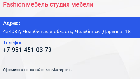 Fashion мебель, студия мебели по адресу 454087, Челябинская область, Челябинск, Дарвина, 18 в дальнейшем Организация, размещена в следующих категориях: