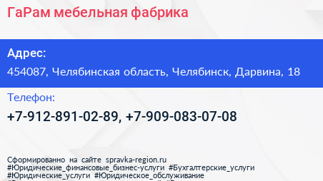 ГаРам, мебельная фабрика по адресу 454087, Челябинская область, Челябинск, Дарвина, 18 в дальнейшем Организация, размещена в следующих категориях:
