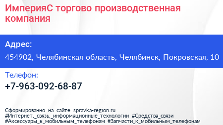 ИмперияС, торгово-производственная компания по адресу 454902, Челябинская область, Челябинск, Покровская, 10 в дальнейшем Организация, размещена в следующих категориях: