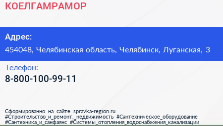 КОЕЛГАМРАМОР по адресу 454048, Челябинская область, Челябинск, Луганская, 3 в дальнейшем Организация, размещена в следующих категориях: