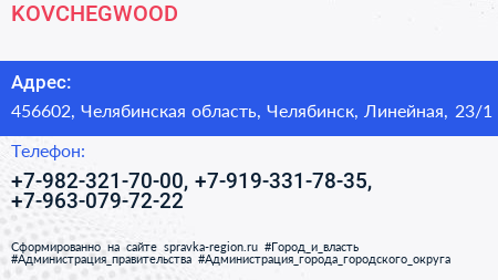 KOVCHEGWOOD по адресу 456602, Челябинская область, Челябинск, Линейная, 23/1 в дальнейшем Организация, размещена в следующих категориях: