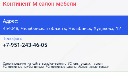 Континент-М, салон мебели по адресу 454048, Челябинская область, Челябинск, Худякова, 12 в дальнейшем Организация, размещена в следующих категориях: