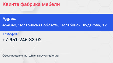 Квинта, фабрика мебели по адресу 454048, Челябинская область, Челябинск, Худякова, 12 в дальнейшем Организация, размещена в следующих категориях: