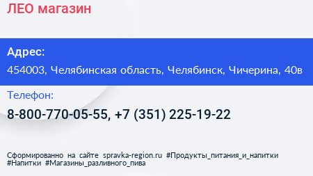 ЛЕО, магазин по адресу 454003, Челябинская область, Челябинск, Чичерина, 40в в дальнейшем Организация, размещена в следующих категориях: