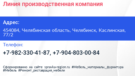Линия, производственная компания по адресу 454084, Челябинская область, Челябинск, Каслинская, 77/2 в дальнейшем Организация, размещена в следующих категориях: