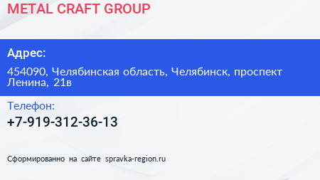 METAL CRAFT GROUP по адресу 454090, Челябинская область, Челябинск, проспект Ленина, 21в в дальнейшем Организация, размещена в следующих категориях:
