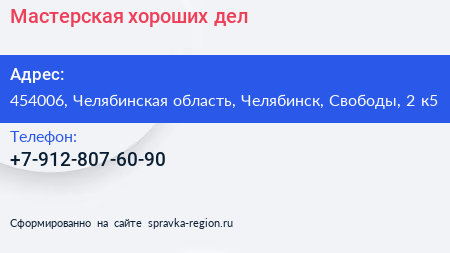 Мастерская хороших дел по адресу 454006, Челябинская область, Челябинск, Свободы, 2 к5 в дальнейшем Организация, размещена в следующих категориях: