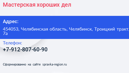 Мастерская хороших дел по адресу 454053, Челябинская область, Челябинск, Троицкий тракт, 7а в дальнейшем Организация, размещена в следующих категориях: