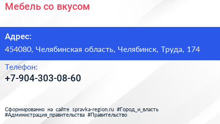 Мебель со вкусом по адресу 454080, Челябинская область, Челябинск, Труда, 174 в дальнейшем Организация, размещена в следующих категориях: