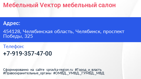Мебельный Vектор, мебельный салон по адресу 454128, Челябинская область, Челябинск, проспект Победы, 325 в дальнейшем Организация, размещена в следующих категориях: