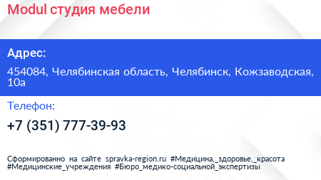 Modul, студия мебели по адресу 454084, Челябинская область, Челябинск, Кожзаводская, 10а в дальнейшем Организация, размещена в следующих категориях: