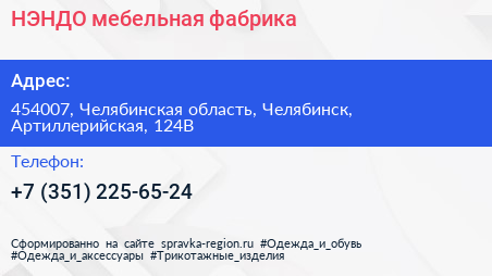 НЭНДО, мебельная фабрика по адресу 454007, Челябинская область, Челябинск, Артиллерийская, 124В в дальнейшем Организация, размещена в следующих категориях: