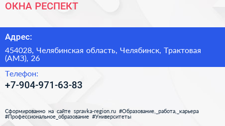 ОКНА РЕСПЕКТ по адресу 454028, Челябинская область, Челябинск, Трактовая (АМЗ), 26 в дальнейшем Организация, размещена в следующих категориях: