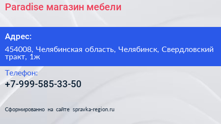 Paradise, магазин мебели по адресу 454008, Челябинская область, Челябинск, Свердловский тракт, 1ж в дальнейшем Организация, размещена в следующих категориях: