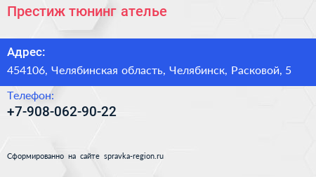 Престиж, тюнинг-ателье по адресу 454106, Челябинская область, Челябинск, Расковой, 5 в дальнейшем Организация, размещена в следующих категориях: