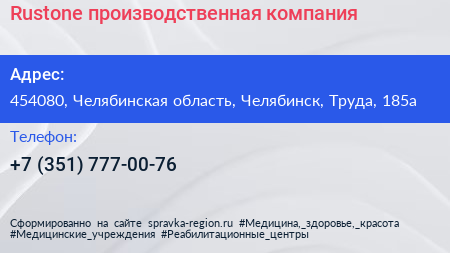 Rustone, производственная компания по адресу 454080, Челябинская область, Челябинск, Труда, 185а в дальнейшем Организация, размещена в следующих категориях: