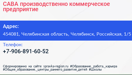САВА, производственно-коммерческое предприятие по адресу 454081, Челябинская область, Челябинск, Российская, 1/5 в дальнейшем Организация, размещена в следующих категориях: