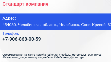 Стандарт, компания по адресу 454080, Челябинская область, Челябинск, Сони Кривой, 83 в дальнейшем Организация, размещена в следующих категориях: