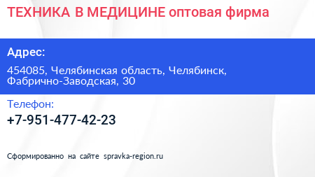 ТЕХНИКА В МЕДИЦИНЕ, оптовая фирма по адресу 454085, Челябинская область, Челябинск, Фабрично-Заводская, 30 в дальнейшем Организация, размещена в следующих категориях: