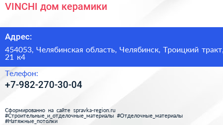VINCHI, дом керамики по адресу 454053, Челябинская область, Челябинск, Троицкий тракт, 21 к4 в дальнейшем Организация, размещена в следующих категориях: