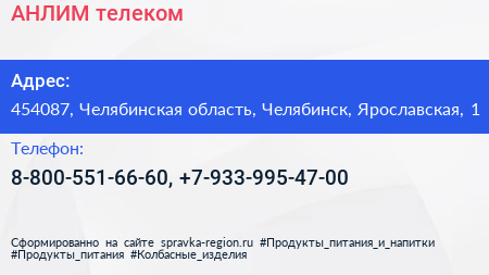АНЛИМ телеком по адресу 454087, Челябинская область, Челябинск, Ярославская, 1 в дальнейшем Организация, размещена в следующих категориях: