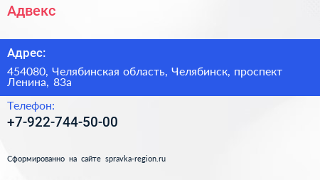 Адвекс по адресу 454080, Челябинская область, Челябинск, проспект Ленина, 83а в дальнейшем Организация, размещена в следующих категориях:
