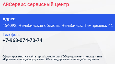 АйСервис, сервисный центр по адресу 454092, Челябинская область, Челябинск, Тимирязева, 41 в дальнейшем Организация, размещена в следующих категориях: