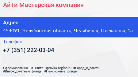 Для связи с организацией воспользуйтесь номером телефона: +7 (351) 222-03-04. Пн: c 09:00-18:00, Вт: c 09:00-18:00, Ср: c 09:00-18:00, Чт: c 09:00-18:00, Пт: c 09:00-18:00, Сб: выходной, Вс: выходной, вы можете обратиться в эту организацию.