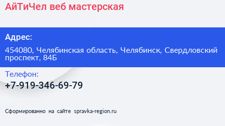 АйТиЧел, веб-мастерская по адресу 454080, Челябинская область, Челябинск, Свердловский проспект, 84Б в дальнейшем Организация, размещена в следующих категориях: