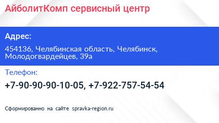 АйболитКомп, сервисный центр по адресу 454136, Челябинская область, Челябинск, Молодогвардейцев, 39а в дальнейшем Организация, размещена в следующих категориях: