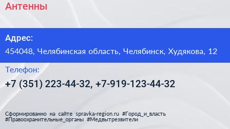 Антенны+ по адресу 454048, Челябинская область, Челябинск, Худякова, 12 в дальнейшем Организация, размещена в следующих категориях: