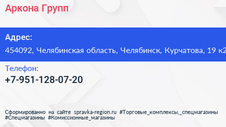 Аркона-Групп по адресу 454092, Челябинская область, Челябинск, Курчатова, 19 к2 в дальнейшем Организация, размещена в следующих категориях: