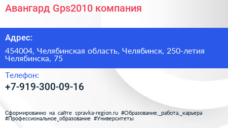 Авангард Gps2010, компания по адресу 454004, Челябинская область, Челябинск, 250-летия Челябинска, 75 в дальнейшем Организация, размещена в следующих категориях: